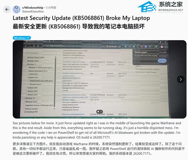 用户 StainedGlassAloe 在 Reddit 论坛表示,他用笔记本电脑玩《星际战甲》时被自动安装了 KB5068861 补丁,随后电脑开始出现黑屏、亮度无法调整等异常现象,且他并没有点击过安装更新按钮,就算卸载掉更新,电脑也会在重启时又自动装回去。