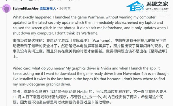 系统之家在此援引 Windows Report,这名用户还指出,这台电脑在安装更新后屏幕就会被锁死在最高亮度,同时无法重装 NVIDIA 显卡驱动程序,反复提示重新下载同一个 Game Ready 驱动,并且日常使用电脑点击应用程序时会随机弹出右键菜单及 UAC 提权窗口,疑似是驱动文件或系统损坏。