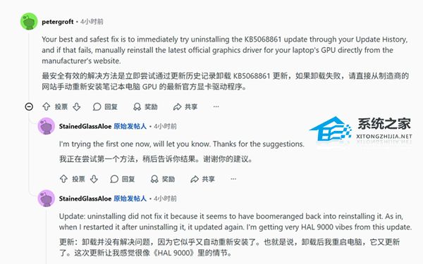 有用户在评论区建议他从显卡制造商官方下载驱动重新安装,但尝试后问题依旧存在,同时该更新还会在每次重启后自动重装,几乎无法彻底删除。
