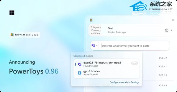 系统之家 11 月 20 日最新消息,微软发布了 PowerToys 最新的 0.96 版本,此次更新并未引入任何新工具,但对现有功能进行了显著改进。此次更新的关键改进包括高级粘贴模块,该模块现在可以连接到多个 AI 模型提供商,以及命令面板的性能提升。下面让我们一起来看看完整的内容吧。