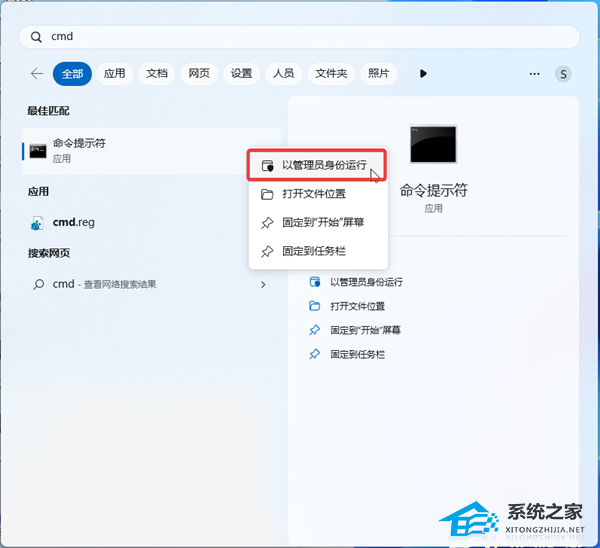3. 按下 Win 键(或者使用鼠标)打开开始菜单,输入“cmd”,然后选择“以管理员权限”打开命令提示符。