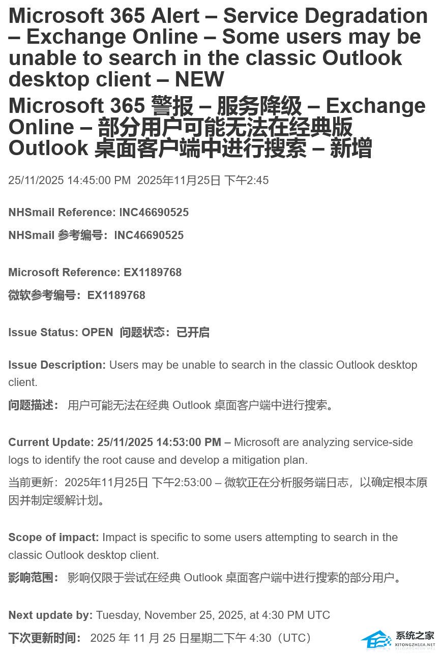 该故障追踪编号为 EX1189768,微软表示世界协调时间 11 月 20 日 5 点 05 分(系统之家注:北京时间 20 日 13 点 05 分)开始,部分 Outlook 用户出现搜索问题。