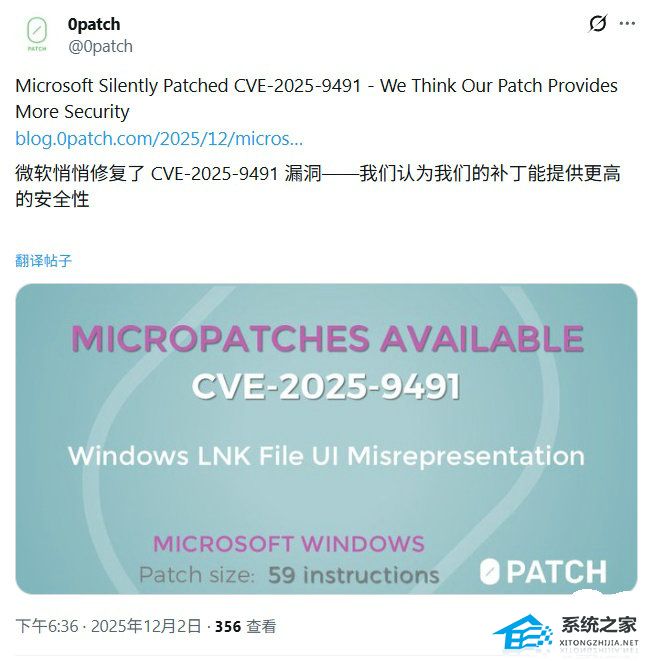 系统之家 12 月 3 日最新消息,微软已通过未公开说明的更新,修复了 Win11 系统中编号为 CVE-2025-9491 的 LNK 文件高危漏洞。该漏洞最早可追溯至 2025 年 3 月,8 月底公开披露后被零日计划(ZDI)评为 CVSS 7.0 分高危级别。微软最初以“不符合漏洞标准”为由拒绝发布补丁。