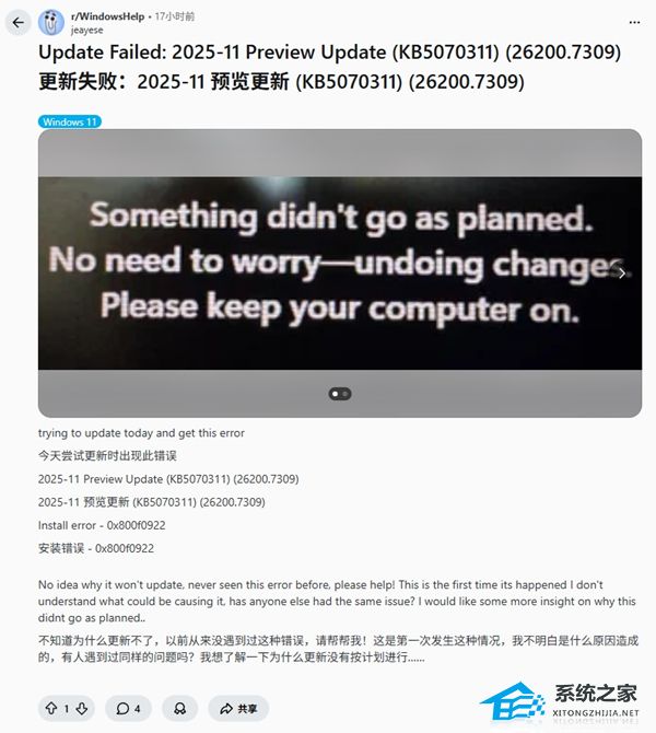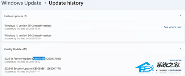 系统之家 12 月 5 日最新消息,微软向 Win11 用户所发布的 11 月可选更新(KB5070311)出现多个 BUG。多位用户反馈安装失败、深色模式下文件资源管理器频繁白屏闪烁、登录界面密码图标消失,以及英特尔 Arc 独显设备出现蓝屏或黑屏死机。