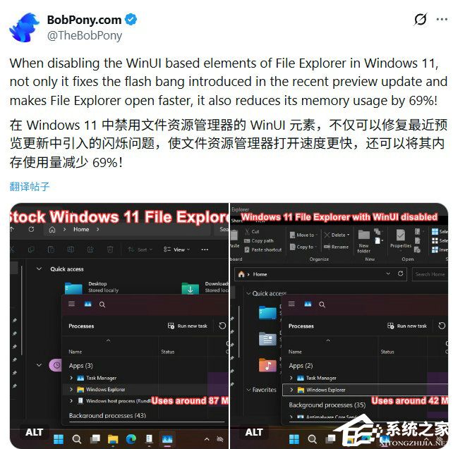 Bob Pony 指出,非 WinUI 模式下的资源管理器逻辑更简单、负担更轻,因此在加载速度和内存控制上表现优异。对于深受 UI 卡顿和 Bug 困扰的用户而言,这无疑是一个极具吸引力的优化方向。