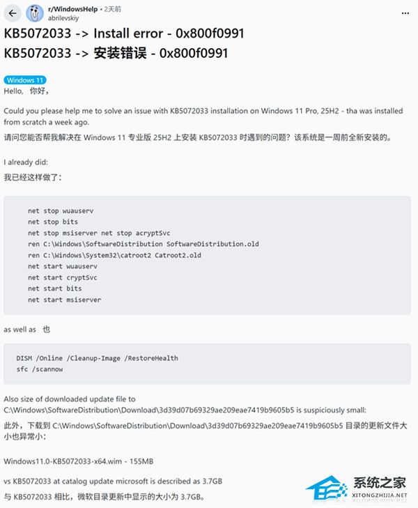 系统之家 12 月 15 日最新消息,多名 Windows 11 用户反馈在安装微软 12 月累积更新 KB5072033 时遭遇失败,错误代码为 0x800f0991,目前常规修复手段无效,不过社区提出两种临时方案,下面就让我们一起来看看吧。