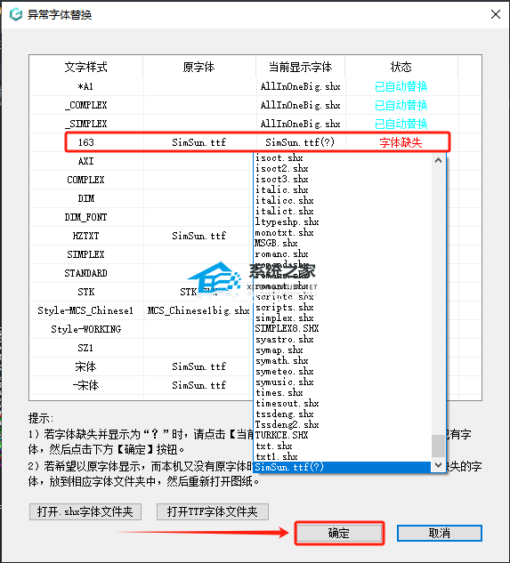 2. 当图纸中存在异常字体时,会弹出【异常字体替换】对话框,列出缺失的异常字体。点击需要缺失的字体后,在弹出的下拉框中选择已有字体,点击【确定】即可。