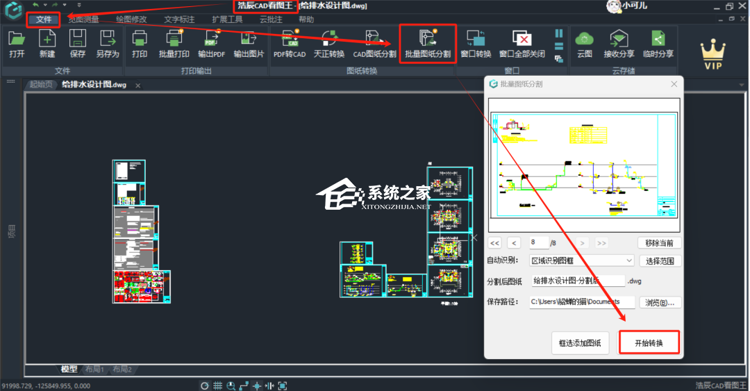 3. 选择好需要分割的范围之后我们还可以设置分割后图纸的保存路径,方便我们后续查找图纸。