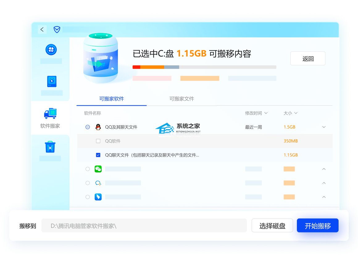 扫描缓存、聊天文件、下载文件、可搬家或清理释放C盘空间。