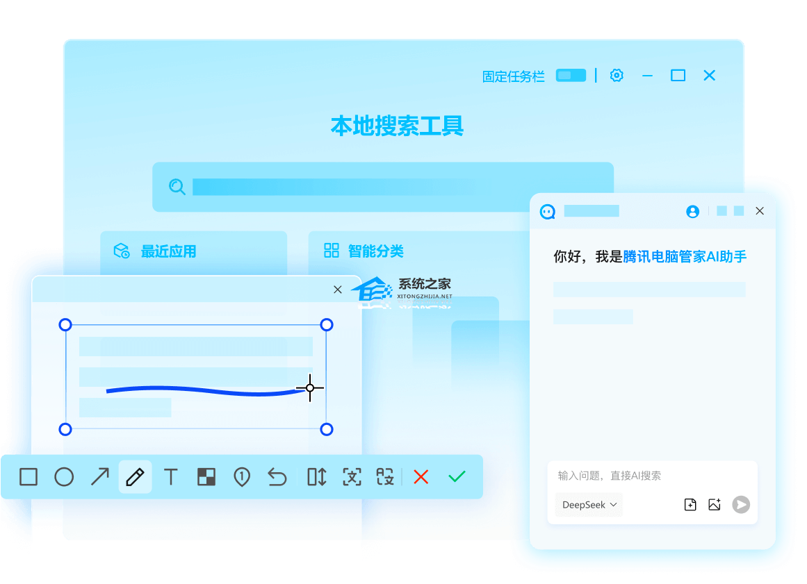 桌面整理、腾讯硬件检测,腾讯网络测速,腾讯软件搬家,腾讯网络修复等实用小工具都可以在软件市场查找并一键使用