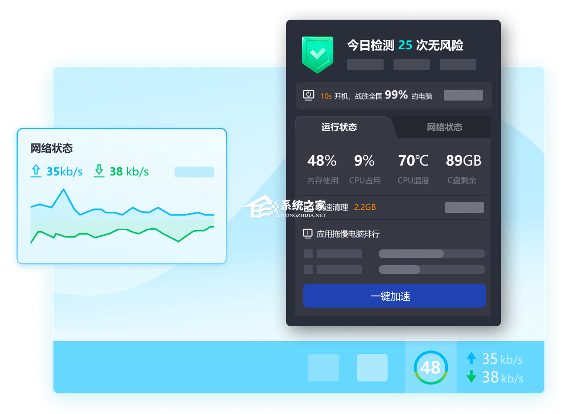 实时cpu占用,系统盘空间剩余等功能路径:【点击电脑界面悬浮球-悬浮球主界面点击运行状态-查看系统盘详情】功能,打开小管家侠轻界面,一目了然,方便快捷。