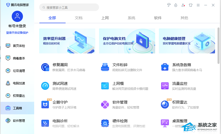 安全相关的工具箱功能,合入到了【安全工具】内,功能路径【主界面左下角安全工具-“系统漏洞修复、系统急救箱、文件粉碎、文档守护者”】。