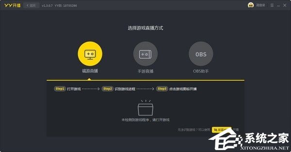 1. 首先确保游戏已经打开,然后打开 YY 开播工具,点击“游戏直播”进入到游戏直播模式界面。