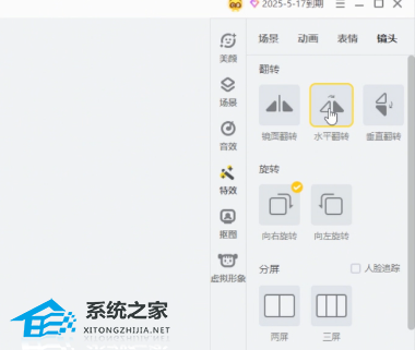 2. 取消镜像效果:如果不需要镜像效果,点击特效 tab,点击镜头,取消勾选水平翻转。