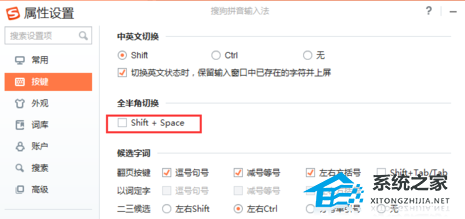 3. 打开搜狗输入法属性设置页面,在该页面中点击勾选“Shift+Space”键切换半全角功能,并点击“确定”按钮。
