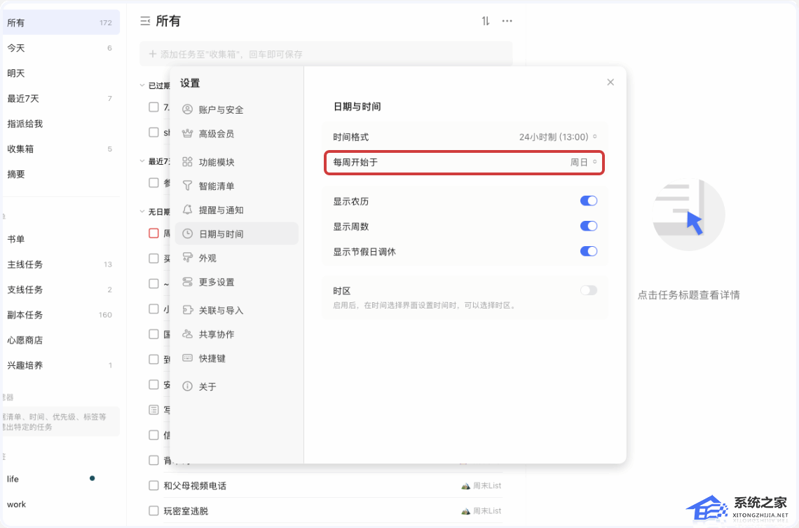 点击「头像」-「设置」-「日期与时间」-「星期开始于」,你可以选择“周日”、“周一”、或”周六“任意一天为一周的开始。