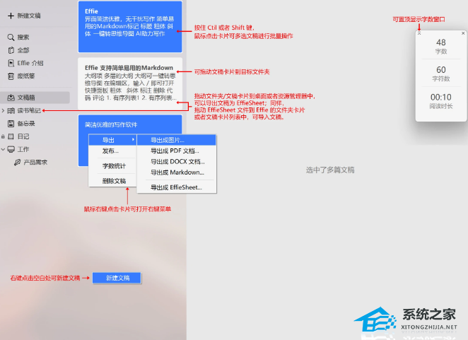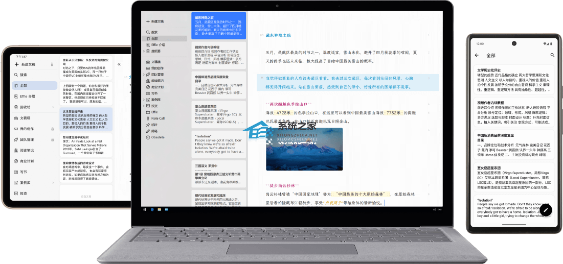 Effie集多种利器于一身,三栏式文稿管理,云端存储,跨平台支持,多格式导出。让你犹如站在崇山峻岭之上,轻易占尽优势。著叶满枝翠羽盖,开花无数黄金钱。