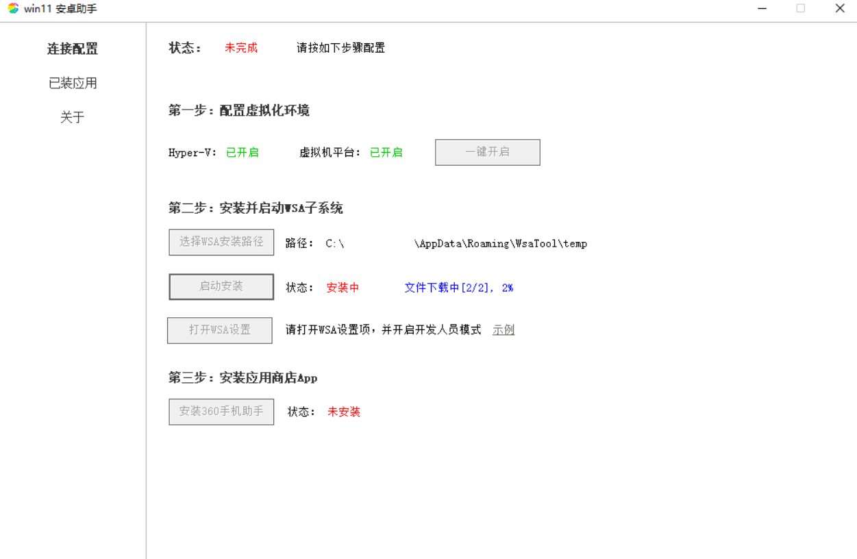 PS:在安装完成后WSA安装工具依旧会显示未完成,但这是因为你没有安装360手机助手,所以完全可以无视,安装APP推荐用微软商店的这个应用:http://xitongzhijia.mg188.cn/soft/230356.html