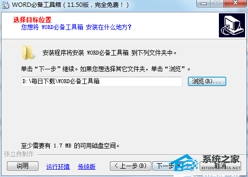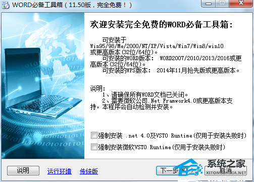 1. 在系统之家将WORD必备工具箱下载下来,并解压到当前文件夹中,点击其中的WORDtoolVSTO.exe应用程序,进入安装向导界面,接着点击下一步。