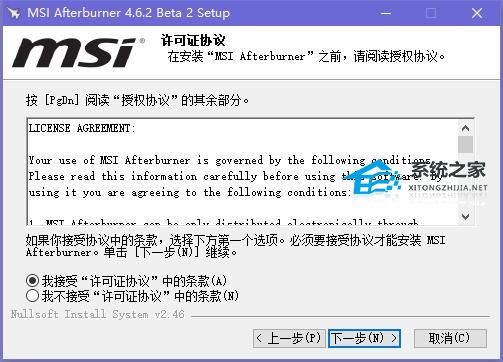 2. 阅读MSI Afterburner许可证协议,点击“我接受许可证协议中的条款”,点击“下一步”继续。