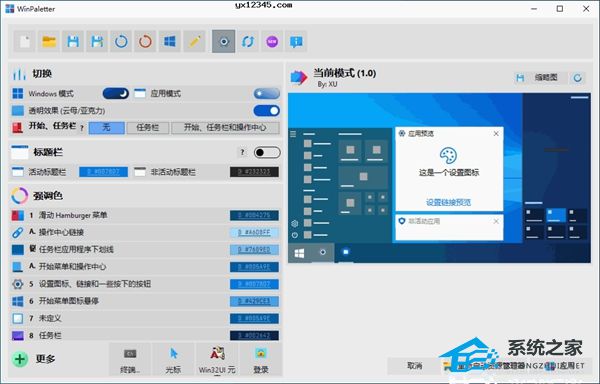 WinPaletter是一款简单易用的调色板工具,支持单独修改系统界面的一些元素颜色,例如标题栏、任务栏、开始菜单等等。同时还支持修改经典的UI界面配色、登录界面的颜色、支持将设置好的颜色方案导出等。喜欢的朋友们,可以试着体验看看。