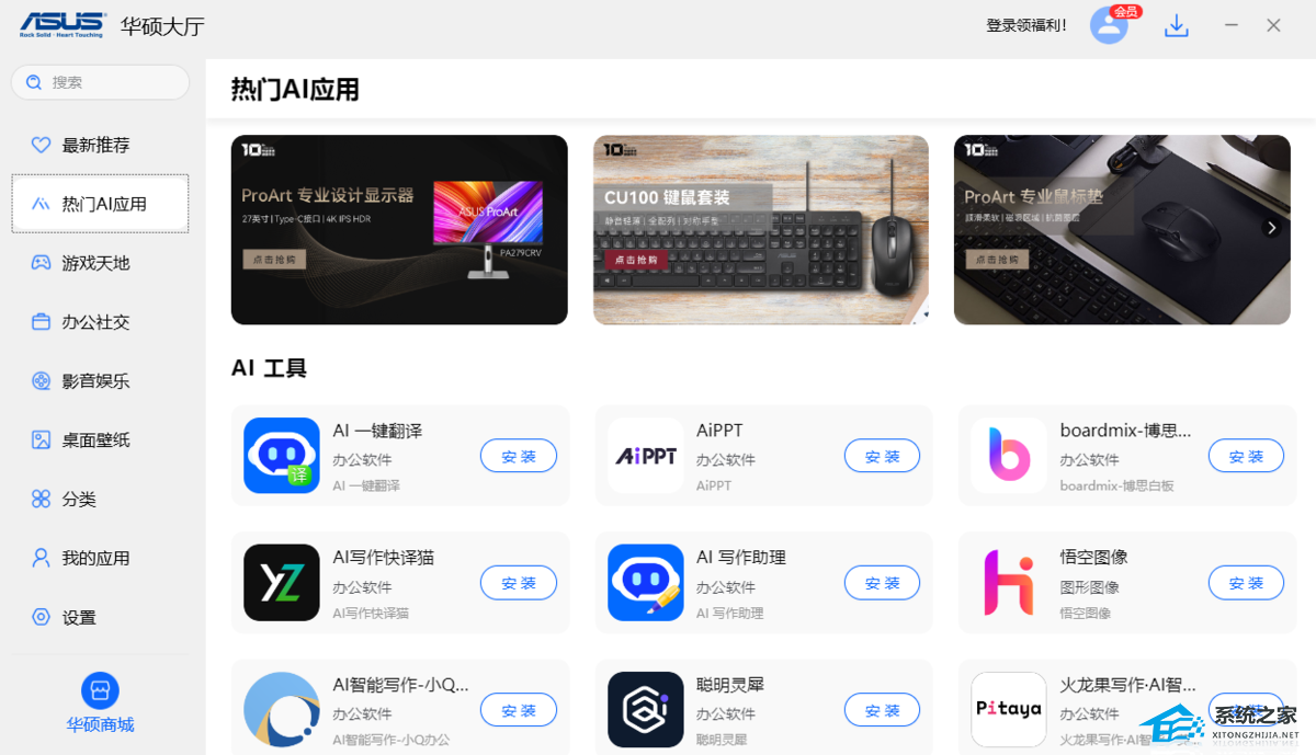 华硕大厅提供丰富的应用软件和游戏资源,支持一键下载、安装及更新。还支持同步功能,用户登录账号后,即可查看同账号在其他电脑上已安装的应用,实现跨设备管理。华硕大厅支持个性化设置,用户可根据需求调整下载路径、清理安装包等。此外,它还提供电脑、零配件等商品的购买渠道,优惠活动众多,让购物更加实惠。