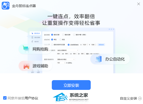 金舟鼠标连点器官方版是一款专为提高用户操作效率而设计的实用工具,通过简单的设置实现连续自动点击,极大地节省了用户的时间和精力。而且这款软件界面简洁直观,操作便捷,为用户节省大量的时间和精力,有需要的用户就可以在本站下载体验。