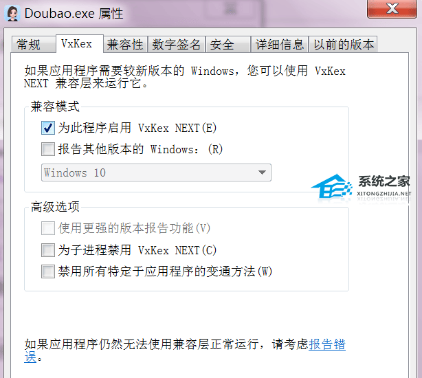 右击应用程序,打开属性,点击VxKex,勾选启用VxKex NEXT,可以自行勾选其他必要设置。