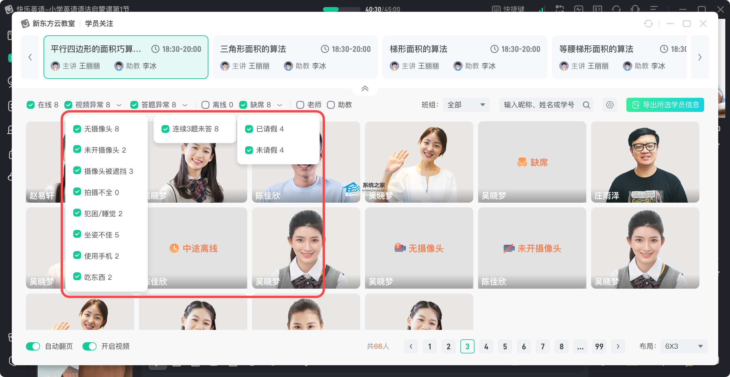 通过AI视频异常检测,系统实时追踪每位学生的听课状态,精准识别黑屏、画面遮挡、走神犯困、玩手机等问题。同时新增答题异常和缺席学员统计。