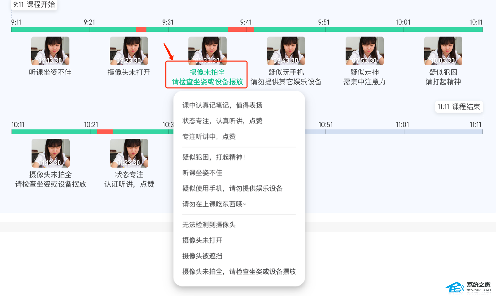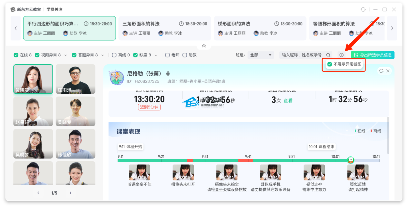 勾选不展示异常图片,课堂表现中将过滤掉以下画面:摄像头被遮挡、犯困/睡觉、使用手机、吃东西。