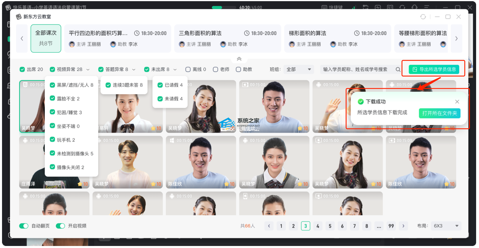 根据勾选的学员范围,点击导出所有学员信息(不包含缺席学员和老师),预计生成和下载时间在30秒左右。