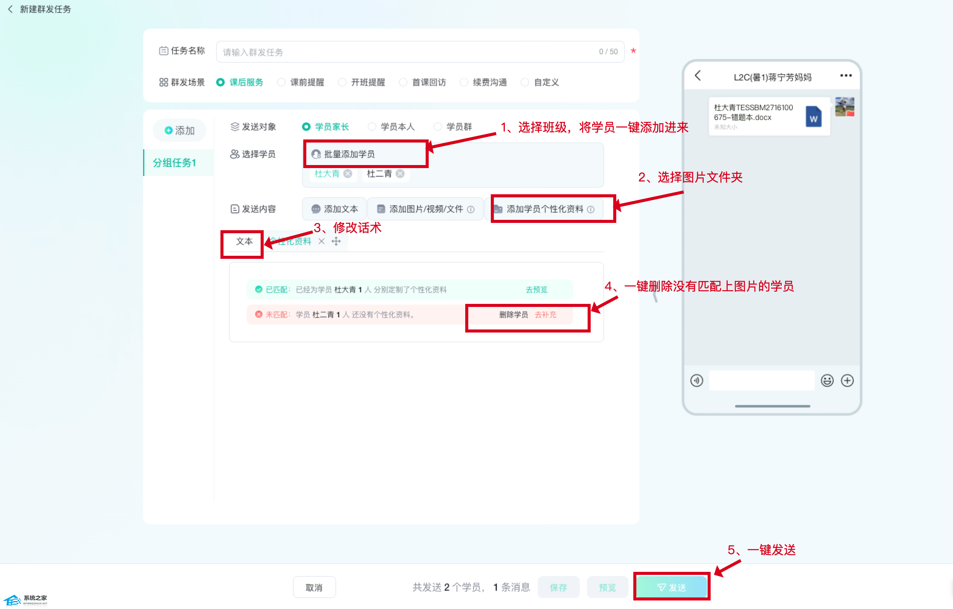 对于其他分校:下载完成后,将压缩包解压,通过【教师精灵】—创建群发任务,就可以一键发送。