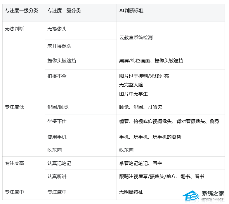 AI持续对学员进行专注度检测,【专注度低】和【无法判断】归为视频异常,具体分类如下:
