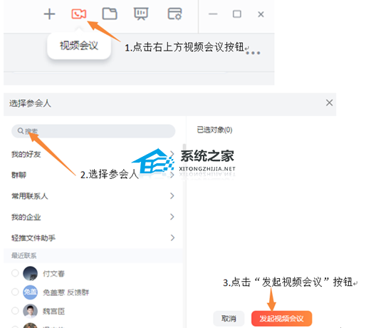 发起会议:点击右上方的视频按钮——选择参会人——发起视频会议。