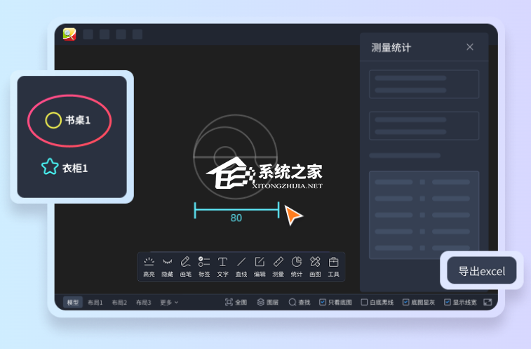 测量功能:点击“测量长度”按钮,然后在图纸上选择需要测量的两点,即可显示两点之间的距离。还新增了绘制弧线测量功能,可测量弧线长度。此外,软件还支持侧面积测量功能,方便计算图形的侧面积。