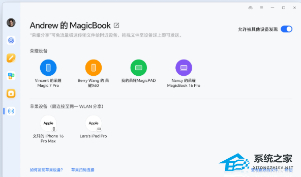 荣耀MagicBook笔记本和iPhone手机的分享互传功能,工作台版本需升级至5.2.1.63及以上并确保“允许被其他设备发现”开关是打开状态,iPhone手机需iOS15版本及以上安装并打开荣耀互联App,开启蓝牙和WLAN开关,且手机和电脑连接同一WIFI网络并保持荣耀互联App在前台。