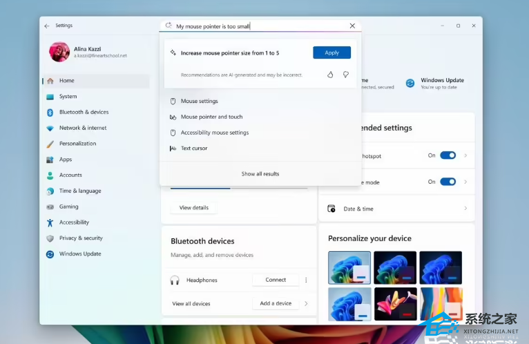 [新增功能]在 Windows 11 AI+ PC 设备上,设置应用中引入新的智能体,帮助用户寻找和更改相关设置。用户可以描述需要帮助的内容,例如“如何通过语音控制我的电脑”或“我的鼠标指针太小”,智能体将会建议解决问题的步骤。