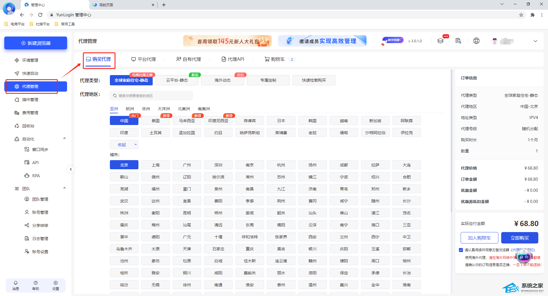 1. 登录云登指纹浏览器,【代理管理】页面,点击【购买代理】进入购买页面。