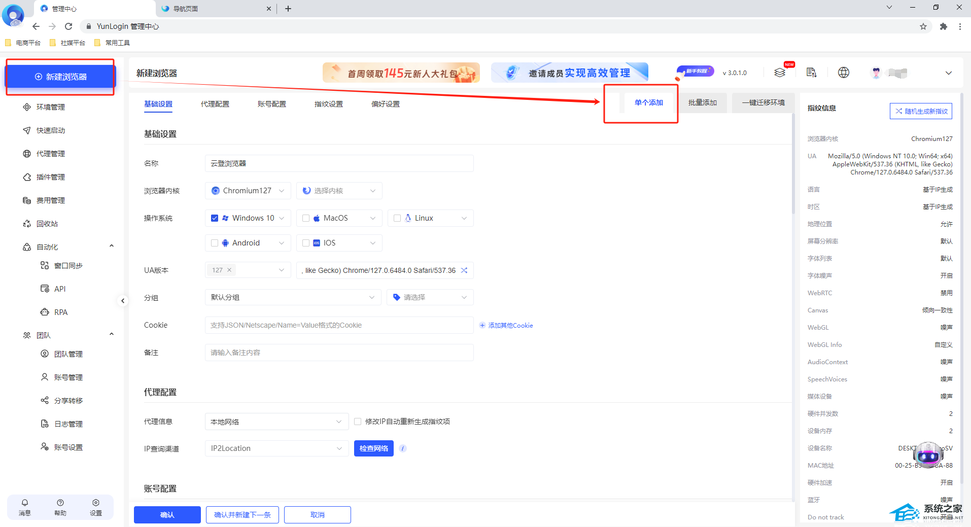 1. 登录云登浏览器,点击【新建浏览器】进入添加账号页面。