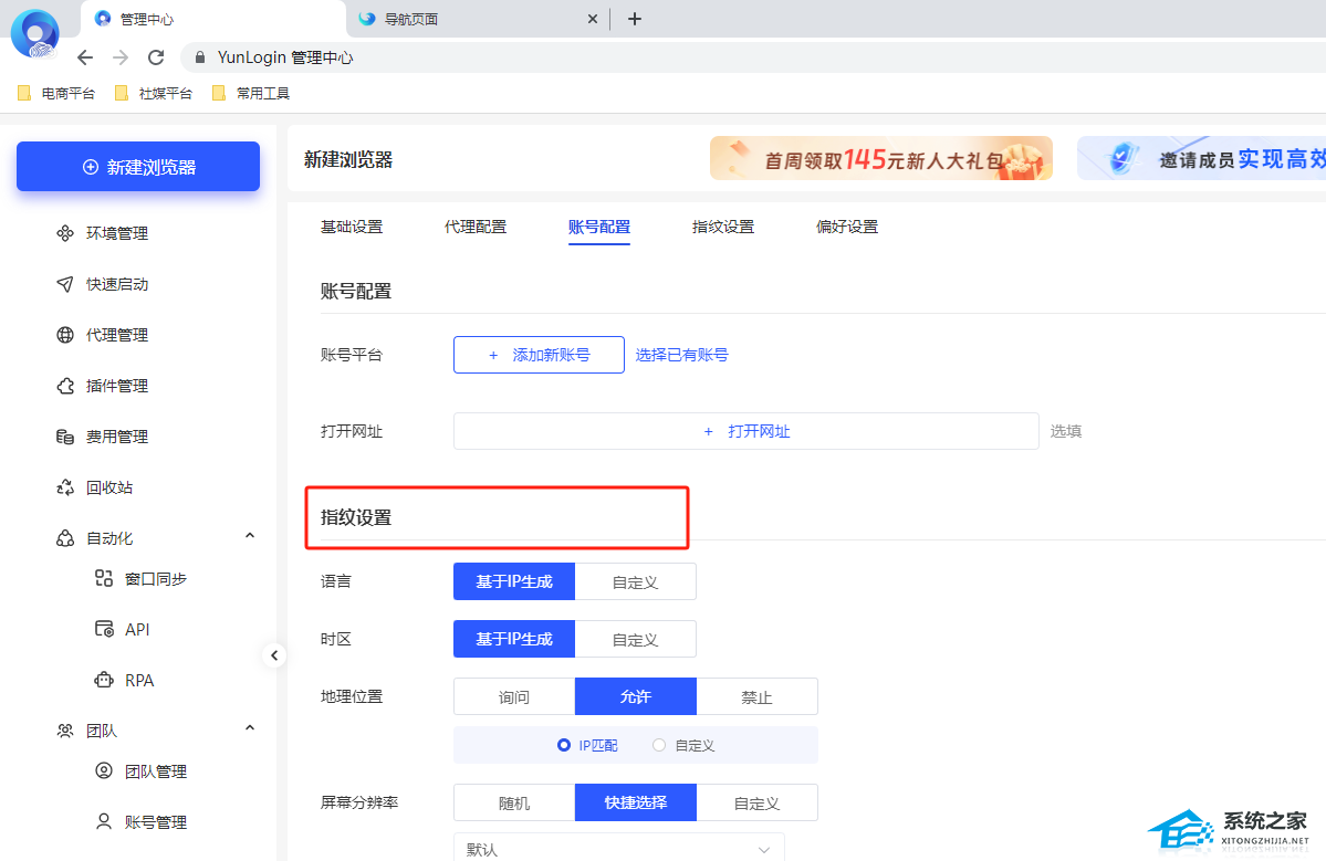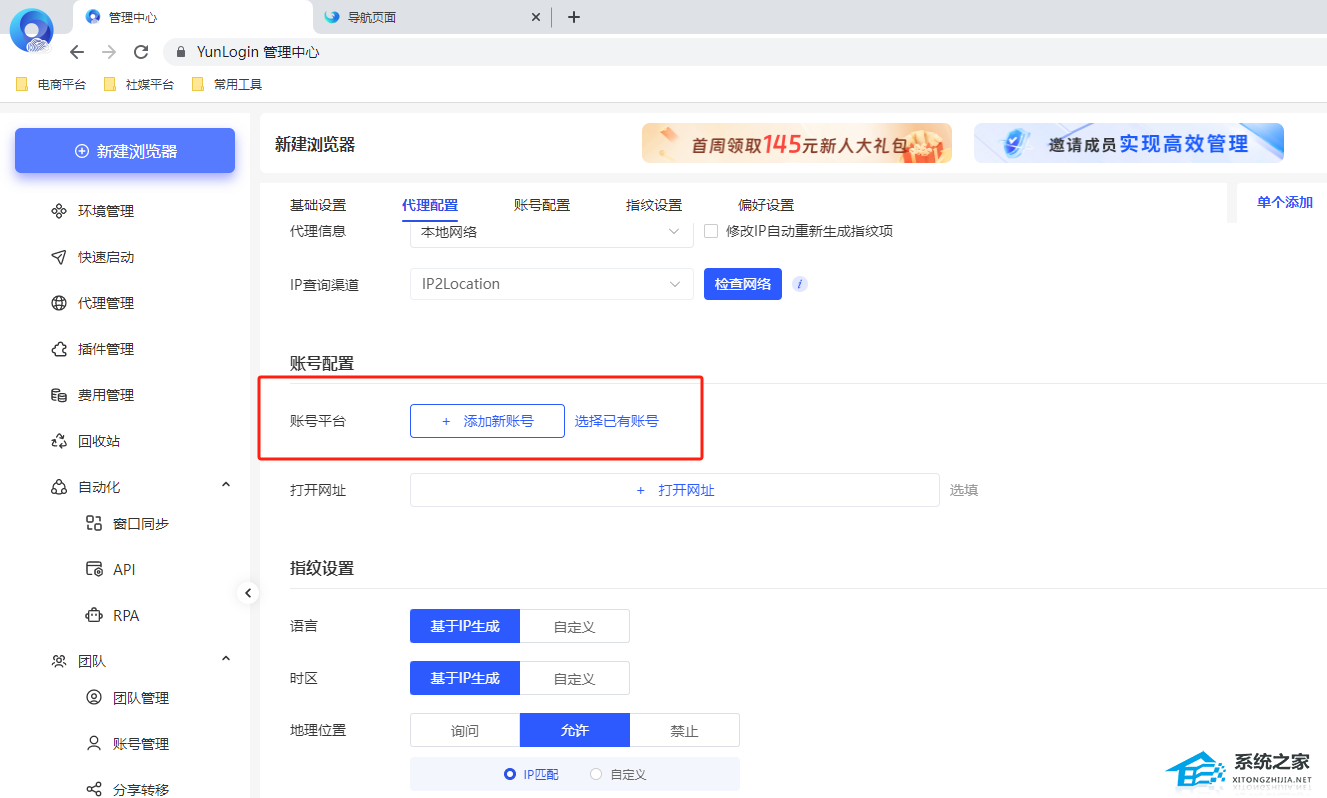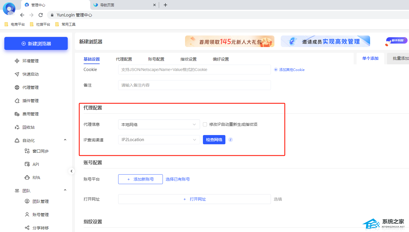 2. 新建浏览器页面输入账号相关的信息,未购买代理,代理暂不需要绑定。