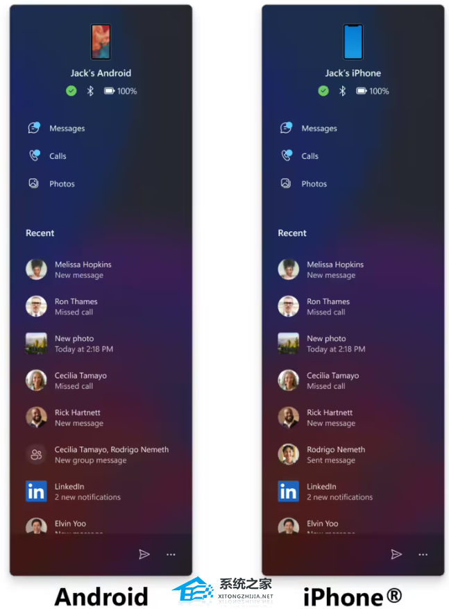 微软重新设计了“移动设备伴侣”界面,采用全新布局,允许用户在开始菜单中滚动查看更多活动,从而及时了解来自移动设备的通知,支持访问短信、通话、照片、移动应用等内容。