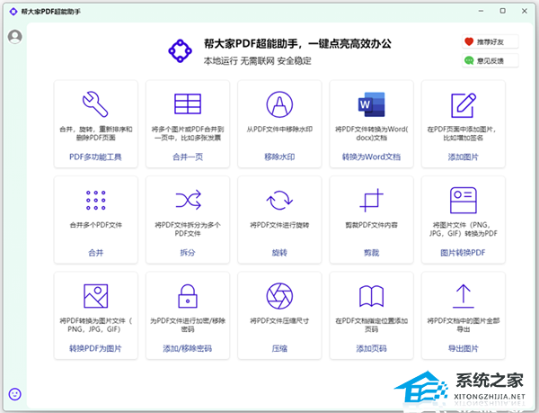 帮大家PDF超能助手官方安装版是一款专业级 PDF 处理工具,该软件不仅无需上传至任何云端服务器!所有操作均在您自己的计算机内存中完成,而且界面设计直观友好,无需复杂学习。只需拖放文件或简单点击,即可快速完成所需操作。
