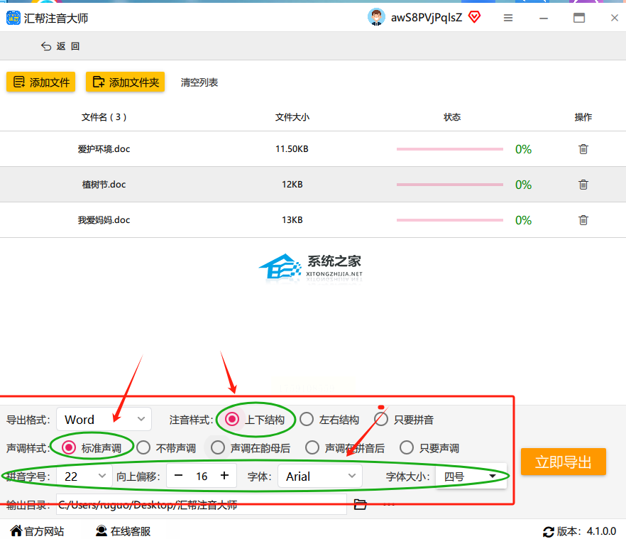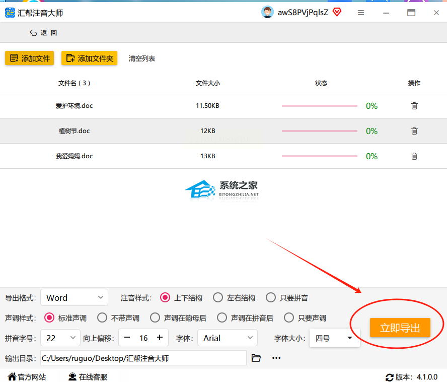 导入完文件后,在软件下方有个“导出格式”的下拉框,选“Word”格式,然后“注音样式”选“上下结构”,这样拼音在汉字上面,看起来最清晰;“声调样式”选“标准声调”,像“┓ó”这种带声调的,保证准确无误。