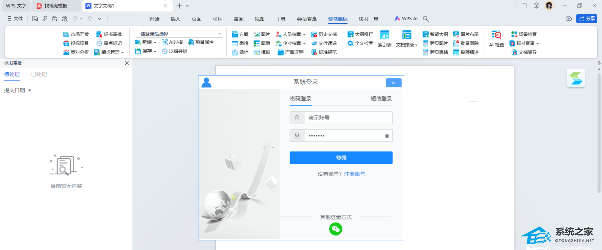 1. 在文档需要使用标书模板的位置,点击快书编标选项卡中的标书模板。