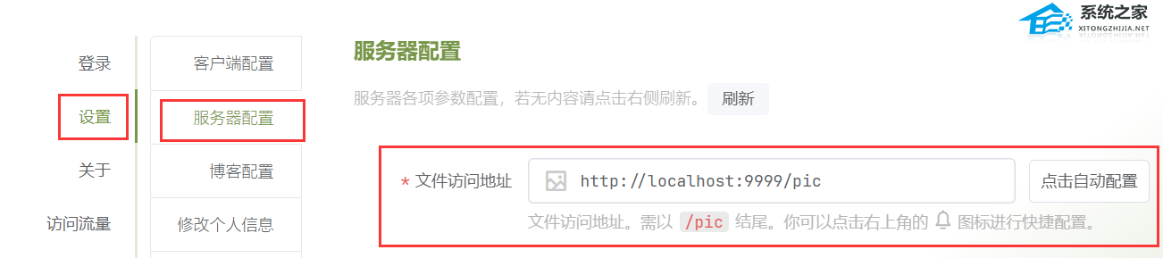 在设置中将文件访问地址已修改为【登录地址 + /pic】,也可点击右侧自动配置按钮,会自动修改为【登录地址 + /pic】。