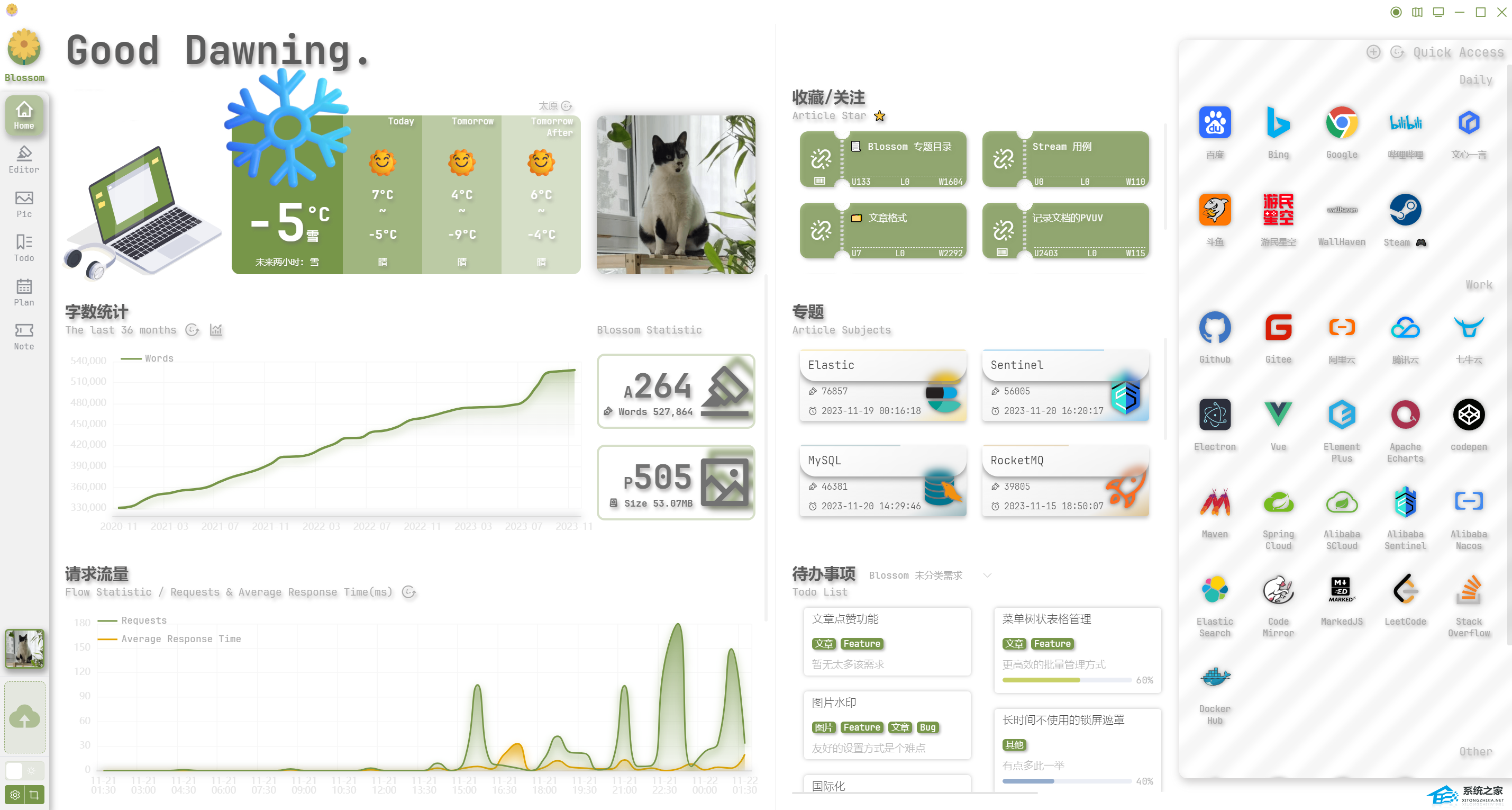 主题设置,番茄钟,字数统计,字数折线图,编辑热力图,天气预报。