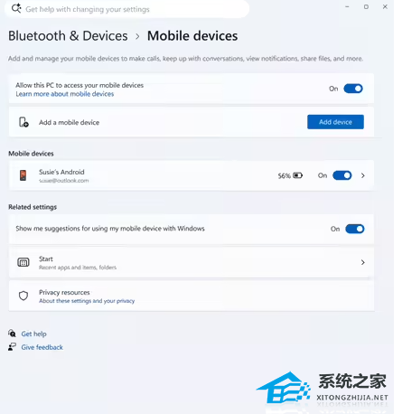 用户可以直接在 Windows 电脑的“设置”中,通过导航至“蓝牙和设备”部分下的“移动设备”来添加和管理您的移动设备。