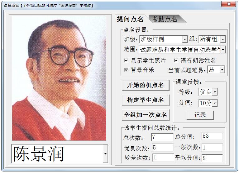 提问点名时,可以对学生随机点名或指定点名,同时还能记录学生点名次数,表现优良次数和总分值。