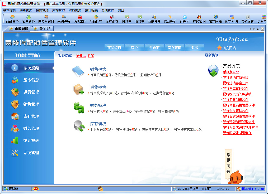 易特汽配销售管理软件是一款专业的销售管理软件,其中包含商品销售管理系统 ,库存管理系统(仓库管理系统),财务和报表系统等子模块。软件界面设计简洁,美观,其人性化的软件流程,使普通用户不需培训也能很快掌握软件操作使用方法,上手极易。